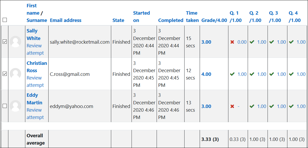 - Scroll-down to see the list of all the attempts in the quiz. From the list find the student/s you want to regrade and tick on the checkbox on the left-side of their name.